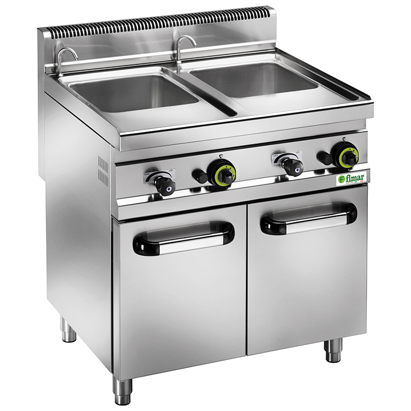 Corps et paniers en acier inoxydable – Cuves en acier inoxydable AISI 316, épaisseur 15/10, sablées avec microsphères spéciales en céramique – système tactile pour éliminer les dépôts d’amidon de pâtes – poignées et boutons en matériau isolant – robinet de remplissage d’eau pratique pouvant être connecté au réseau principal sur le panneau avant – cheminée haute avec fonction de dosseret – brûleurs en inox haute performance, à combustion optimisée, placé sous la cuve, équipé d’une soupape de sécurité et d’un thermocouple – allumage avec flamme piézoélectrique et veilleuse – régulation indépendante de la puissance pour chaque cuve – prêt pour le gaz naturel, fourni avec kit GPL – avec faux fond pour le support des paniers sur un élément neutre.