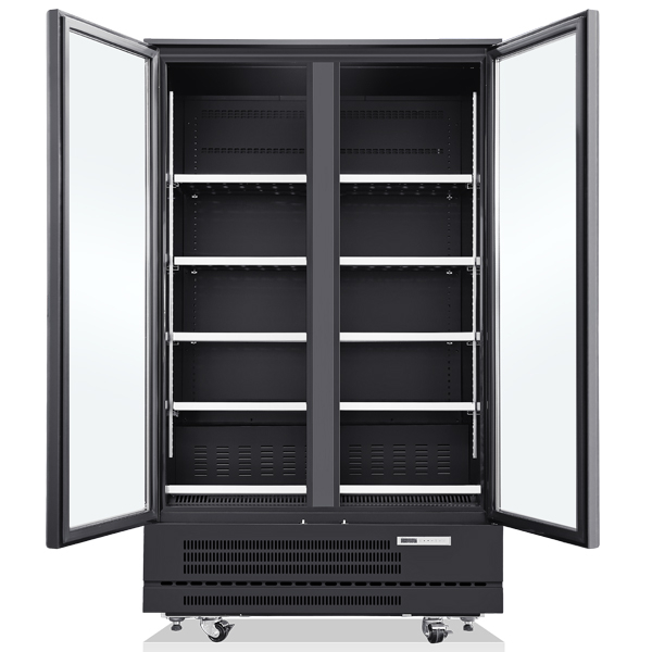 4 lignes d’étagères solides renforcées de 500 mm de large, en tôle peinte en noir (étagères supplémentaires disponibles). Fourni avec 4 étagères par porte. Ces étagères sont conçues pour la présentation des boissons et des aliments. Elles sont idéales pour les supermarchés et les magasins de proximité.