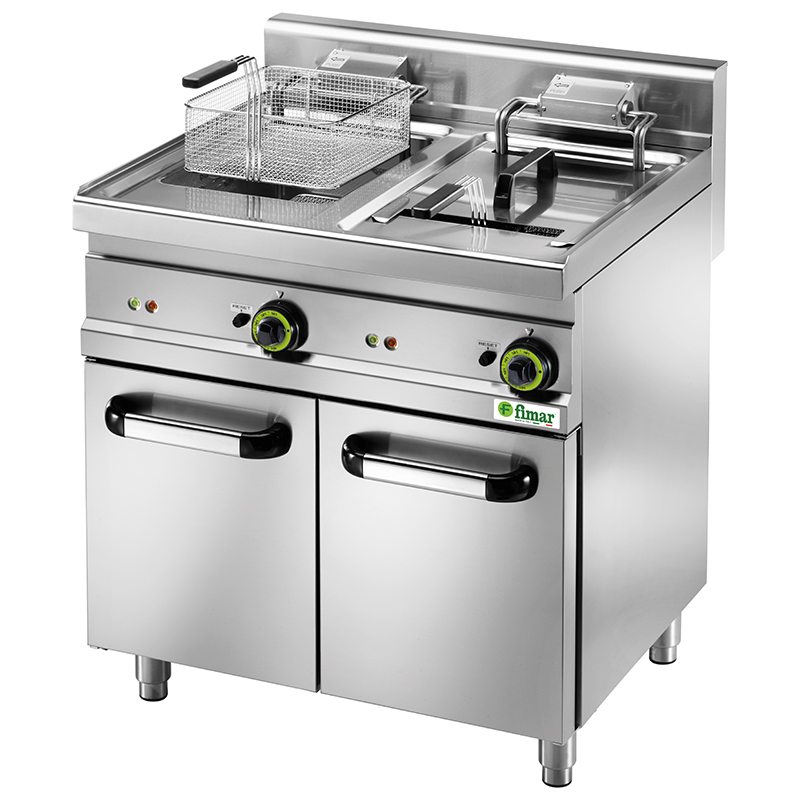 Friteuses capacité 18 L Sur meuble neutre -corps, cuve, couvercle, paniers et résistances en acier inox AISI 304 – poignées et pommeaux des paniers en matériau thermo-isolant – thermostat de sécurité avec bouton de réarmement équipé d’un grand panier – vanne de vidange et bac collecteur d’huile avec filtre et buse en acier inoxydable – Résistances basculantes – grilles de protection dans la cuve. Le modèle SFM18D dispose de deux cuves avec double thermostat pour une utilisation indépendante. Ils atteignent 190°C en environ 6 minutes temps de friture de 5 minutes environ.
